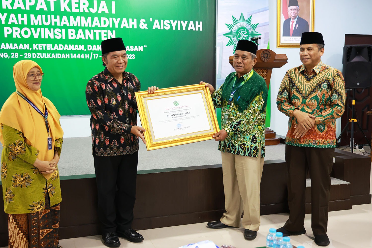 MAHARDHIKAnews.com BANTEN, – Penjabat (Pj) Gubernur Banten Al Muktabar meraih penghargaan dari Pimpinan Wilayah (PW) Muhammadiyah Provinsi Banten. Penghargaan diserahkan Ketua PW Muhammadiyah Syamsudin kepada Al Muktabar pada Pembukaan Rapat Kerja (Raker) Muhammadiyah I PW Muhammadiyah dan Aisyiyah Provinsi Banten, Sabtu (17/6/2023) di Gedung Dakwah PW Muhammadiyah Provinsi Banten, Jl. Ki Ajurum, Cipocok Jaya, Kota Serang.