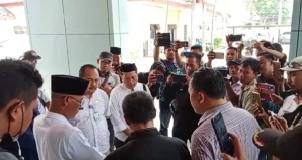 Nampak hadir Camat Kronjo H. Tibi dan sejumlah stafnya menemui para wartawan yang sedang berorasi dalam aksi ini, Jum’at (15/09). Dia pun menerima dengan baik aksi tersebut.