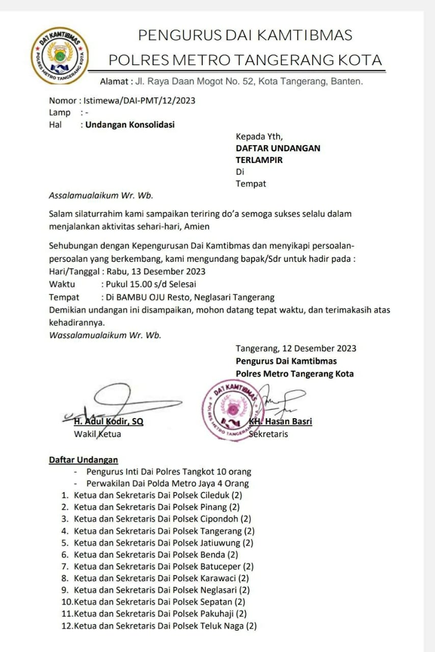 MAHARDHIKAnews.com KOTA TANGERANG, – Forum pengurus Da’i Kamtibmas Polres Metro Tangerang Kota berencana gelar rapat konsolidasi kepengurusan Rabu (13/11/2023) di RM Bambu Oju Neglasari Kota Tangerang.