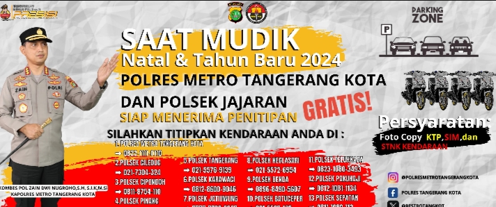 MAHARDHIKAnews.com KOTA TANGERANG, – Kabar baik bagi warga Tangerang di wilayah hukum Polres Metro Tangerang Kota, Polda Metro Jaya yang berencana melakukan mudik perayaan Natal 2023 dan Tahun Baru 2024 (Nataru) dapat menitipkan kendaraan secara gratis.