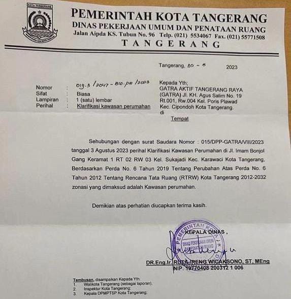 Sementara bukti tertulis dari Dinas PUPR dan dinas perizinan (DPMPTSP) Kota Tangerang menyatakan bahwa bangunan pabrik limbah plastik tersebut hanya berizin bengkel dan berada di zona perumahan.
