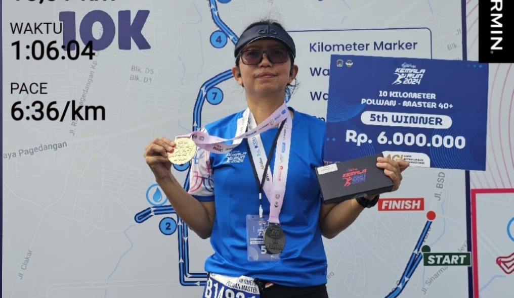MAHARDHIKAnews.com KOTA TANGERANG — Kompol Ery Murniasih, Kasi keuangan (Kasikeu) Polres Metro Tangerang Kota, Polda Metro Jaya berhasil sebagai peserta yang naik podium sebagai juara 5 lari kategori master polwan 10 K usia diatas 40 tahun dalam event Kemala Run 2024 di ICE, BSD, Tangerang Selatan, Minggu, 9 Juni 2024 pagi WIB.