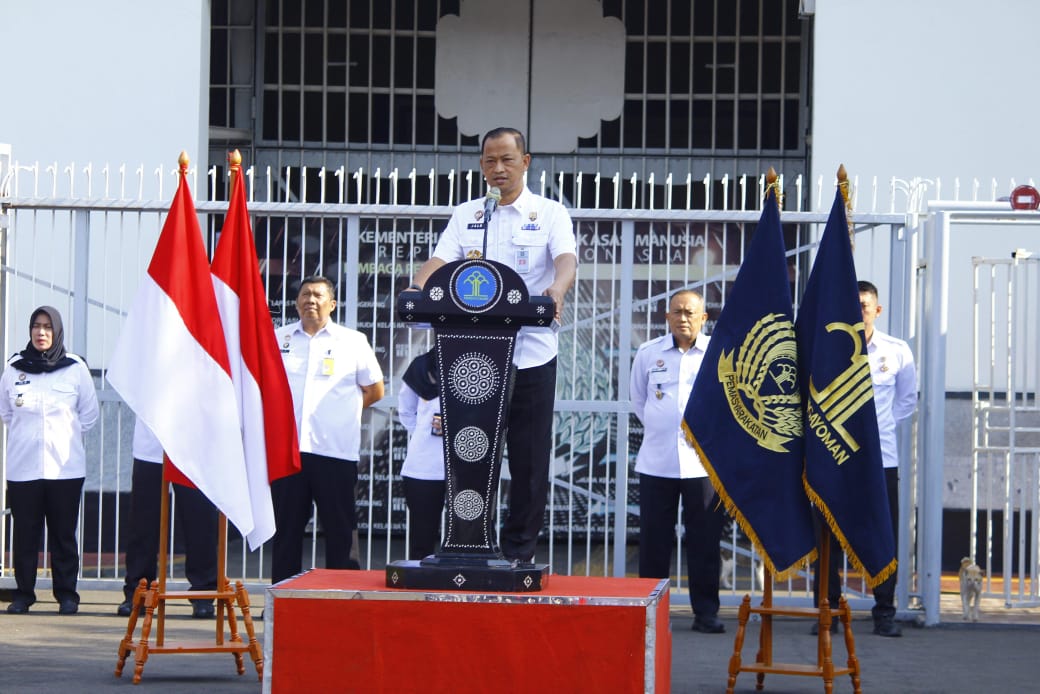 Bertindak sebagai Pembina Apel, Kepala Divisi Pemasyarakatan, Jalu Yuswa Panjang memberikan semangat dan doa kepada atlet untuk berjuang di Kejuaran Nasional Menkumham Cup 2024.