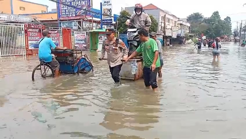 Tak hanya memantau, AKP Edi Suryadi bahkan terjun langsung membantu proses evakuasi warga yang rumahnya terendam banjir.