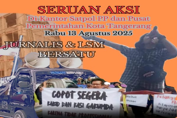 KOTA TANGERANG, – Sejumlah jurnalis dan perwakilan Lembaga Swadaya Masyarakat (LSM) yang tergabung dalam Jurnalis dan LSM Bersatu berencana kembali menggelar aksi damai di Kantor Satpol PP Kota Tangerang dan Kantor Pusat Pemerintahan (Puspem) pada Rabu, 13 Agustus 2025.